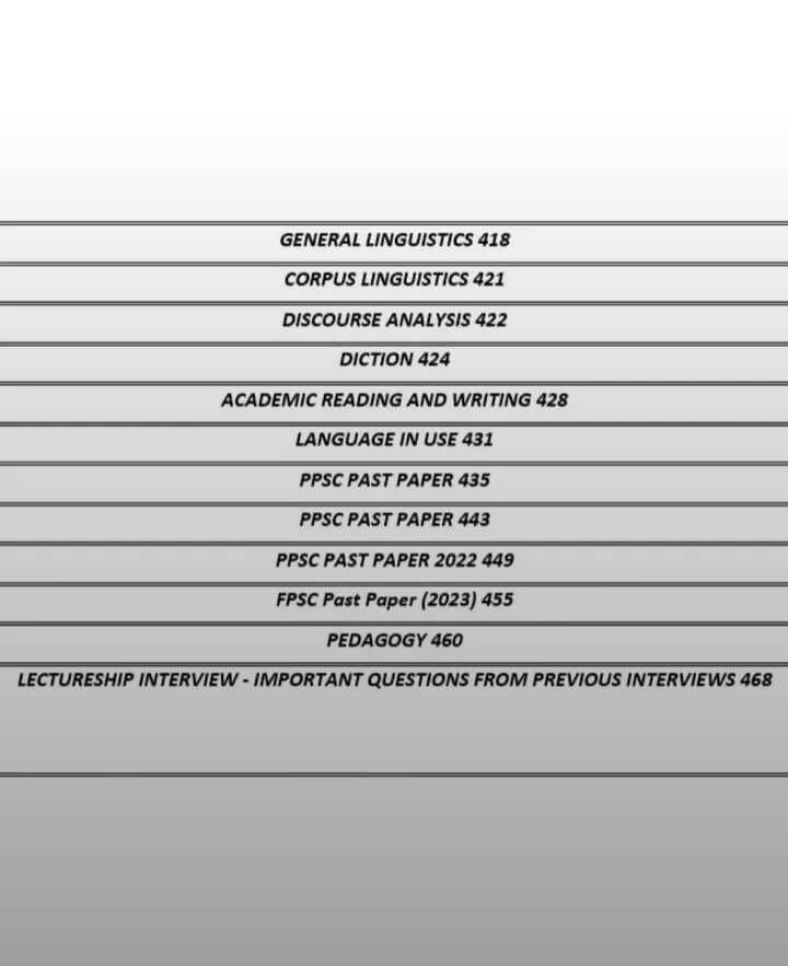 This book is designed for the preparation of English Literature and Linguistics for Lecturership and competitive examinations including PPSC, FPSC, SPSC, KPPSC, BPSC, AJKPSC, and other entrance tests.